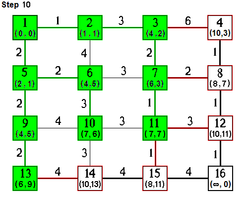 | Step 10. Node 11 is added to the MP tree. Outbound links from node 11 include links to nodes 12 and 15, both being reached for the first time. The corresponding temporary labels are updated and predecessor nodes are set to node 11. |