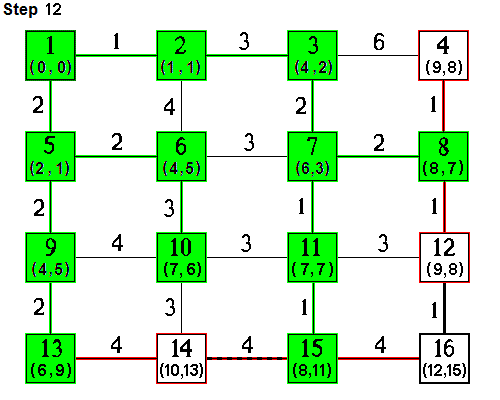 | Step 12. Node 15 is added to the MP tree. Outbound links from node 8 include links to nodes 14 and 16. Node 14 has been reached before and the path via node 15 does not improve the solution so no updating occurs. Node 16 is reached for the first time so the corresponding temporary label is updated and the predecessor node is set to node 15. |