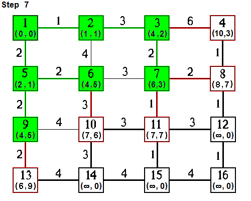 | Step 7. Node 7 is added to the MP tree (there is again a tie with nodes 7 and 13 having the same minimum temporary label; node 7 was reached first). Outbound links from node 7 include links to nodes 8 and 11, both being reached for the first time. The corresponding temporary labels are updated and predecessor nodes are set to node 7. |